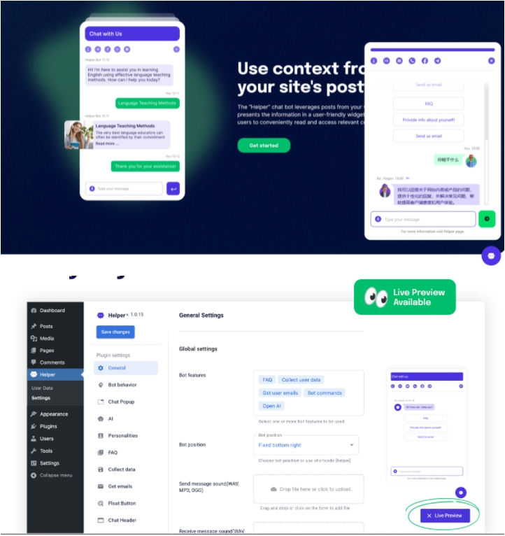 Helper 是一个快速且易于添加的聊天机器人 WordPress 插件,支持常规和 AI Bot 类型。