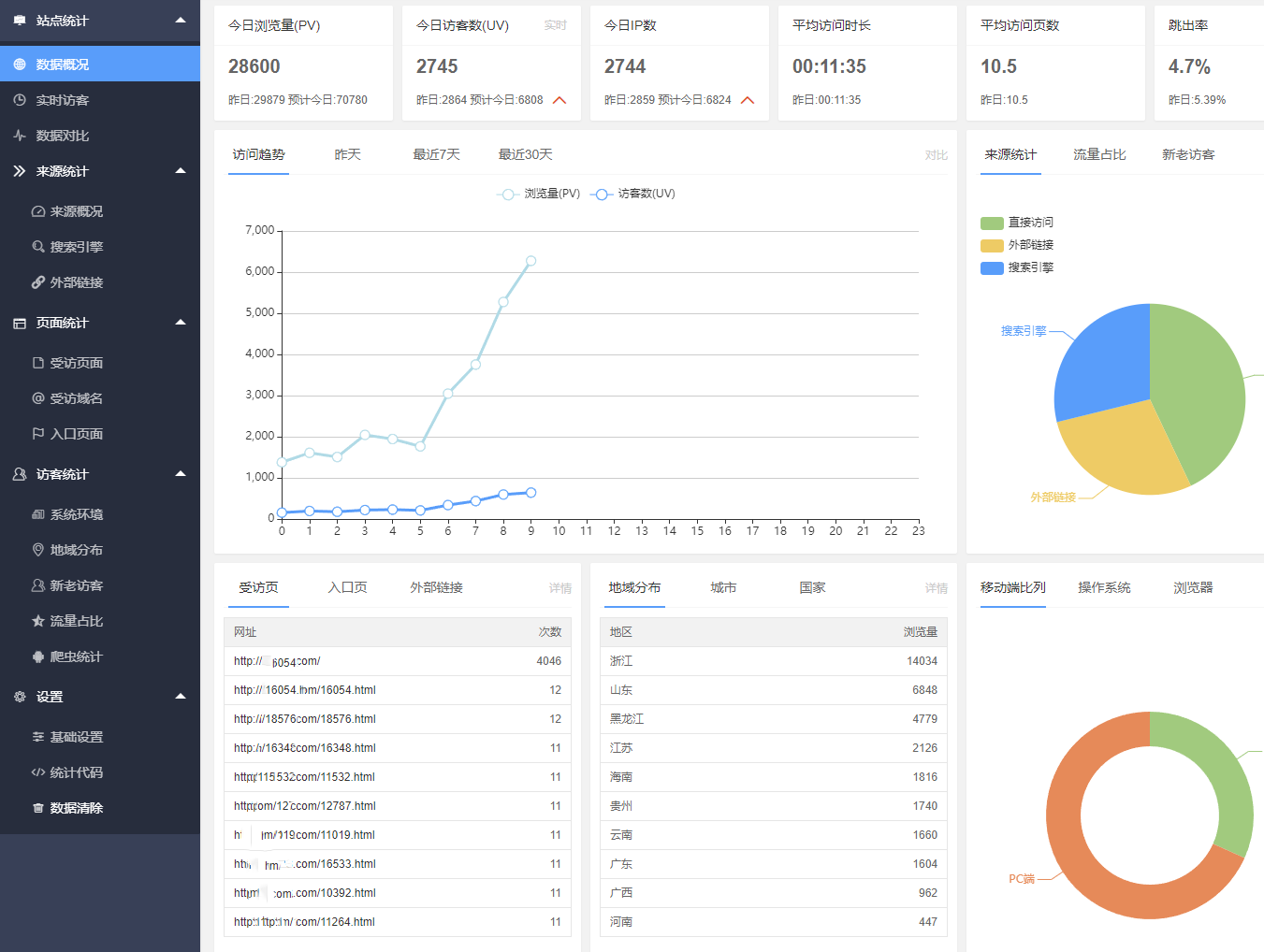 数据概况:显示PV、UV、IP等数据,方便查看。